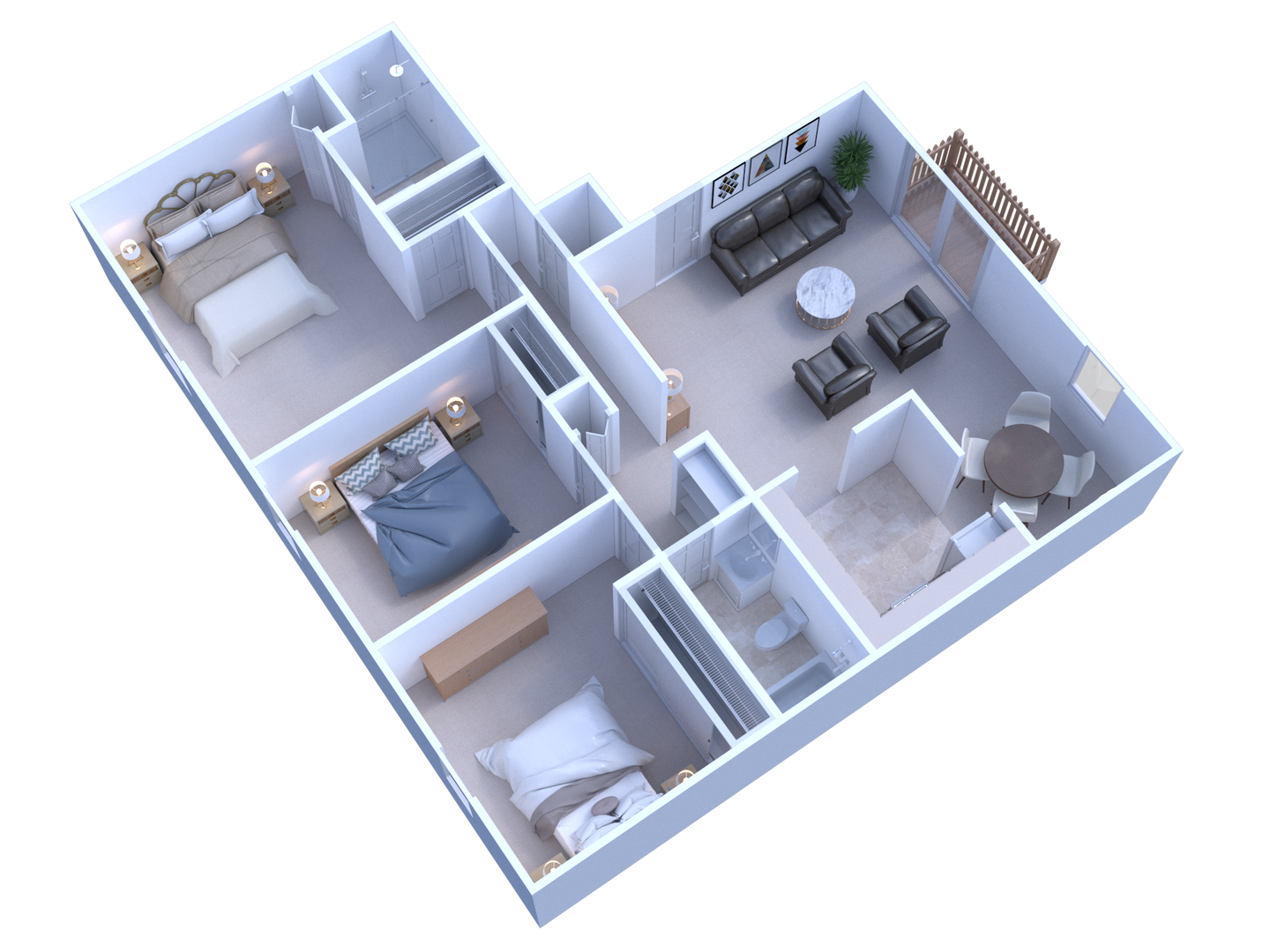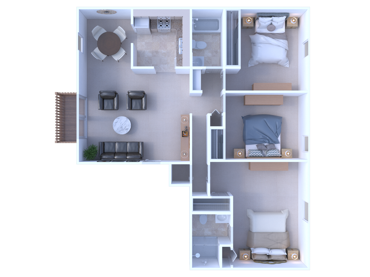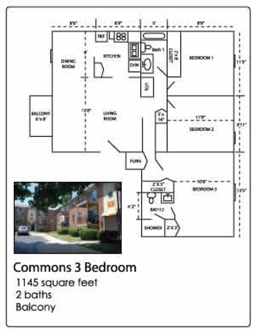 A spacious 1145 sq. ft. three bedroom apartment with two full bathrooms and a balcony located in the heart of Broad Ripple.