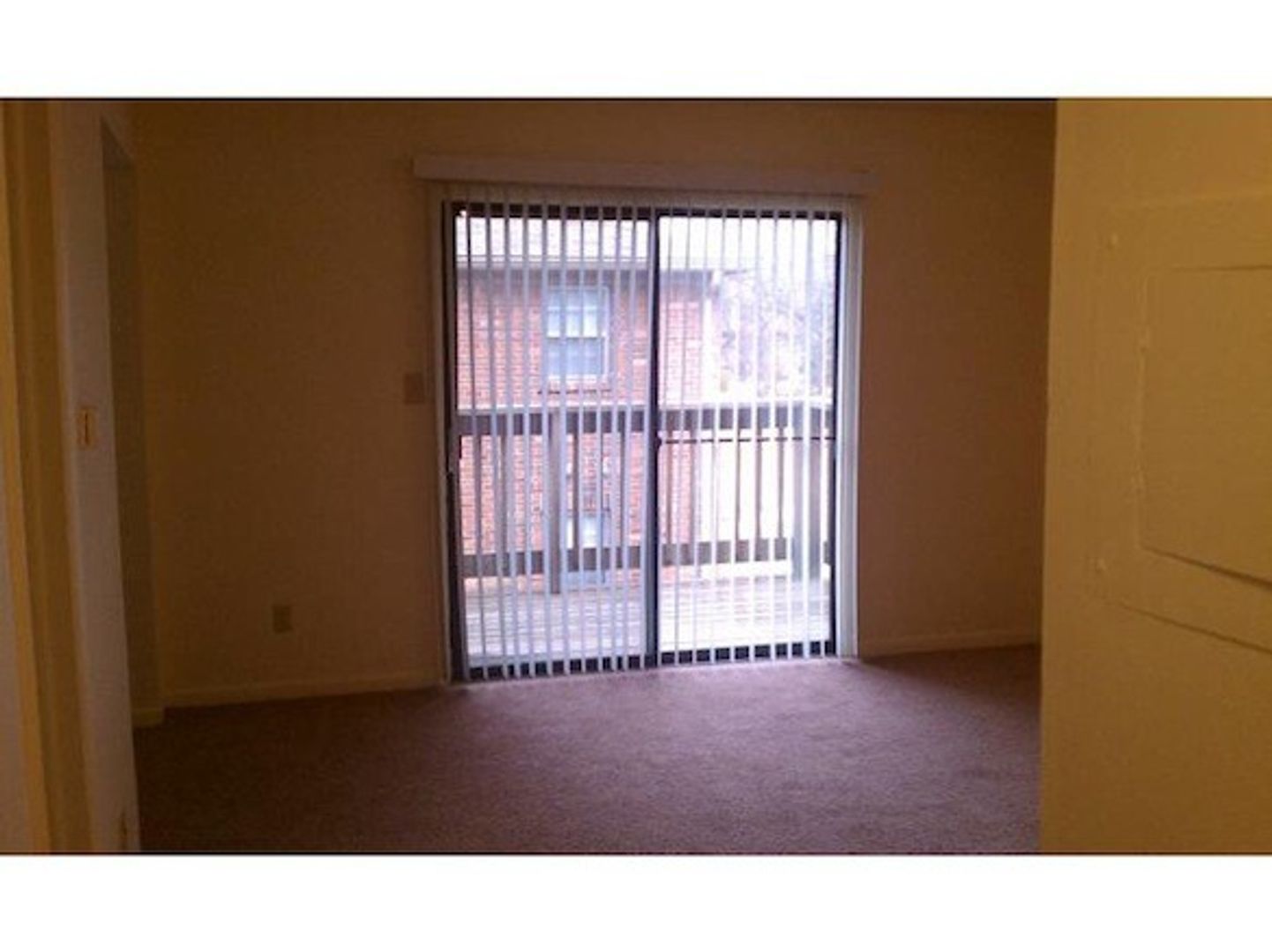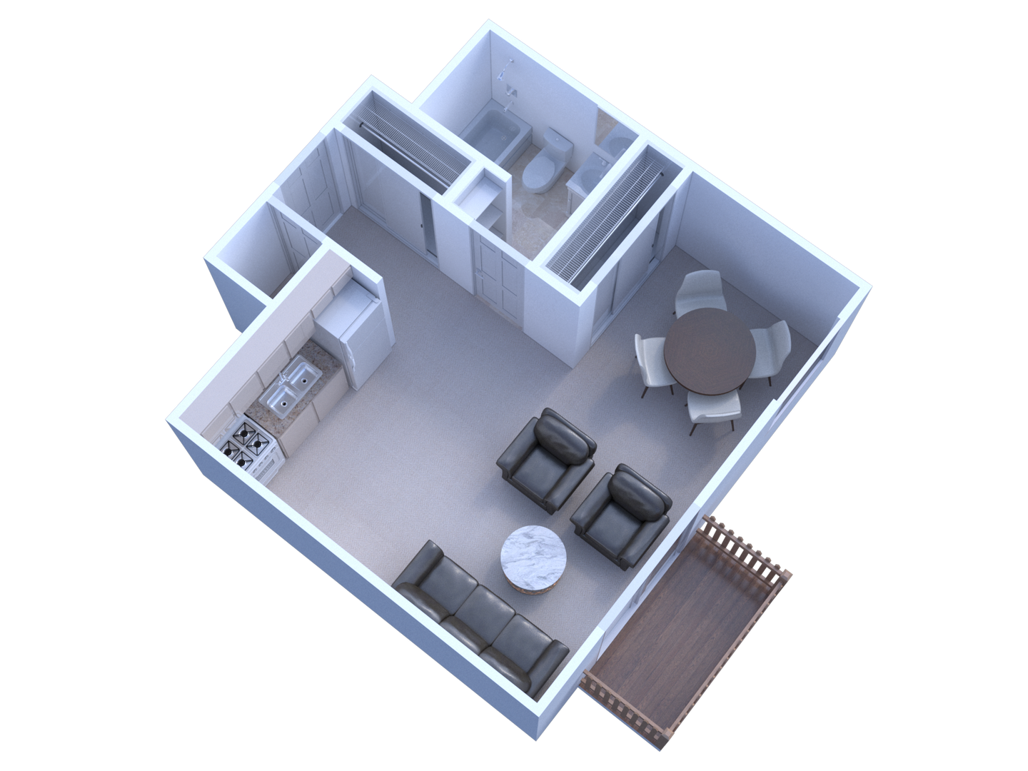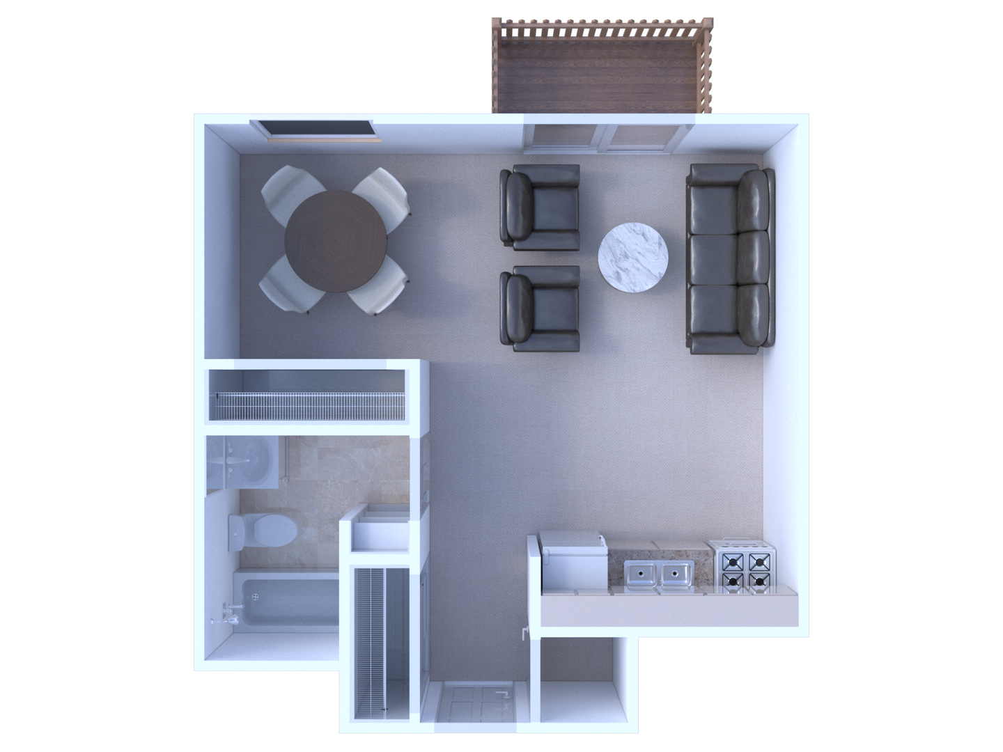 Spacious studio apartment with plenty of closet space and a private balcony.